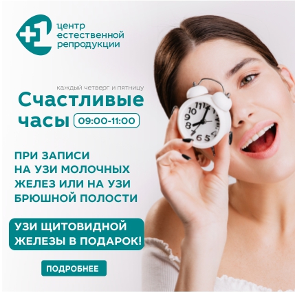 АКЦИЯ ! Счастливые часы! Весь февраль, каждый четверг и пятницу с 9:00 до 11:00 при записи в Центр естественной репродукции на УЗИ молочных желез или на УЗИ брюшной полости - УЗИ щитовидной железы в ПОДАРОК!*